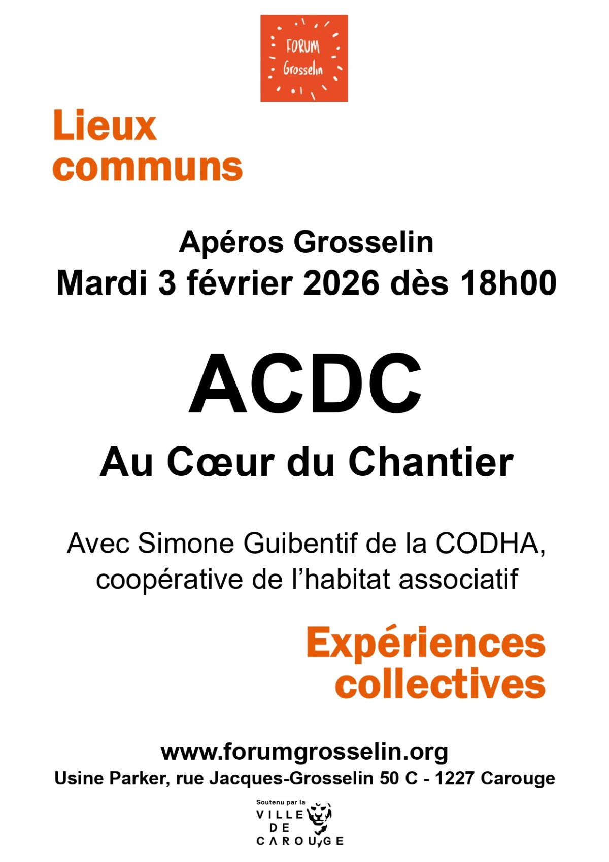 Un rendez-vous régulier à l'heure de l'apéro pour discuter librement de sujets liés à la ville, à l'habitat et aux aménagements urbains. Ce n'est pas tout à fait une conférence, ni une table ronde, mais plutôt une conversation ouverte, sur un thème qui se rapporte, de près ou de loin, à la transformation du quartier Grosselin. Un-e ou plusieurs invité-es sont sollicité-es pour faire une brève introduction, avant d'ouvrir le débat avec une discussion à bâtons rompus, tout cela en croquant une tartelette aux légumes grillés, en dégustant un cru genevois et bien d'autres amuse-bouches préparés par le Forum Grosselin pour l'occasion.