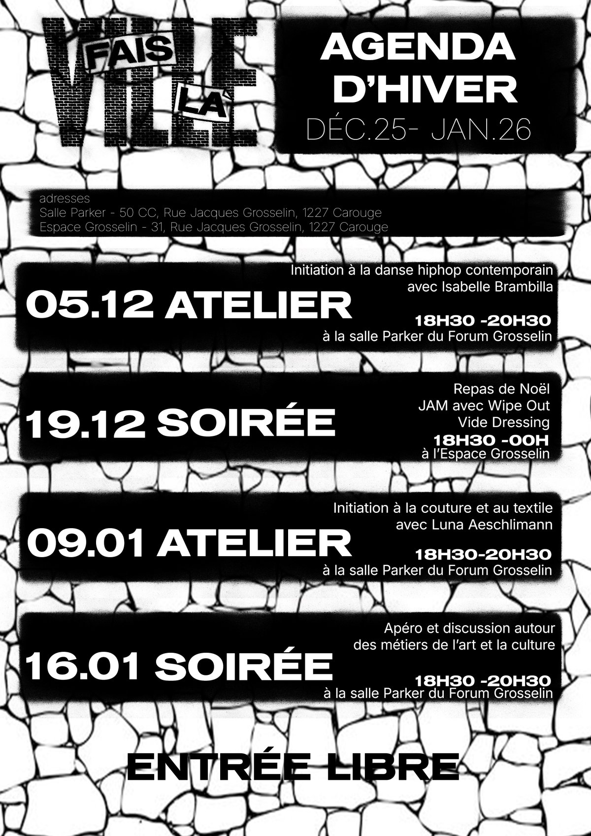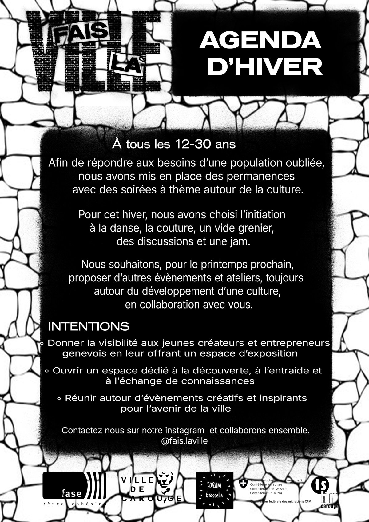 Le projet "Fais la ville" est une initiative de la Ville de Carouge et du Forum Grosselin, en partenariat avec la FASE et les TSHM de Carouge. Le projet qui a débuté à l'automne 2024 et doit durer 3 ans, bénéficie du soutien de la Confédération suisse (Office fédéral des migrations) et du Bureau de l'intégration et de la citoyenneté du canton de Genève (BIC).